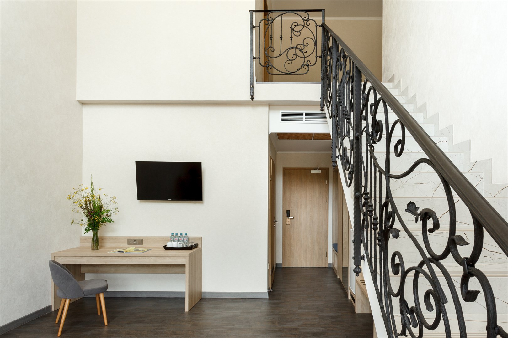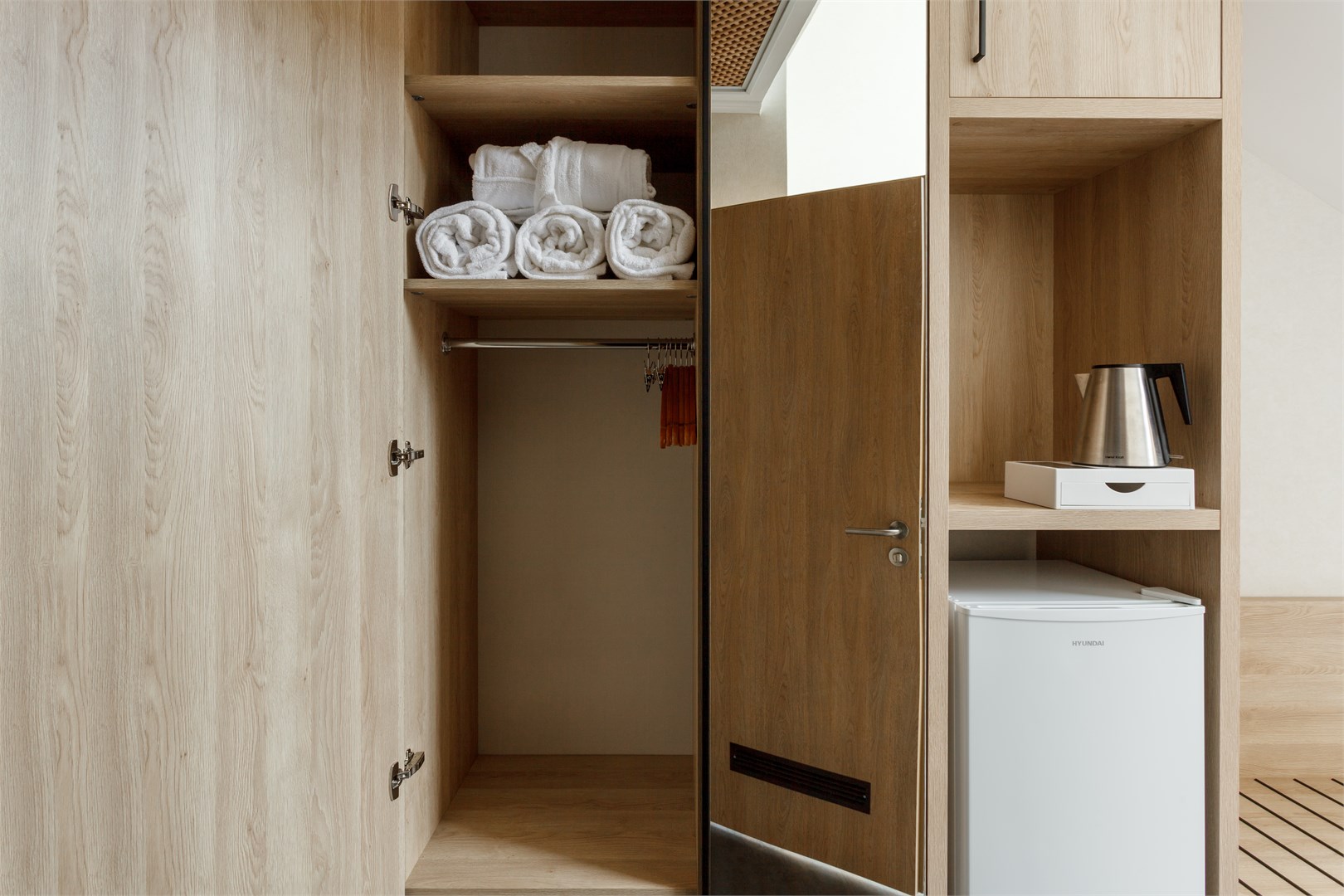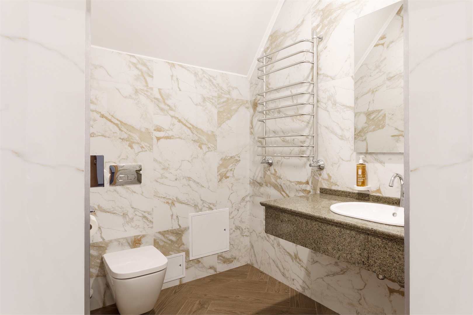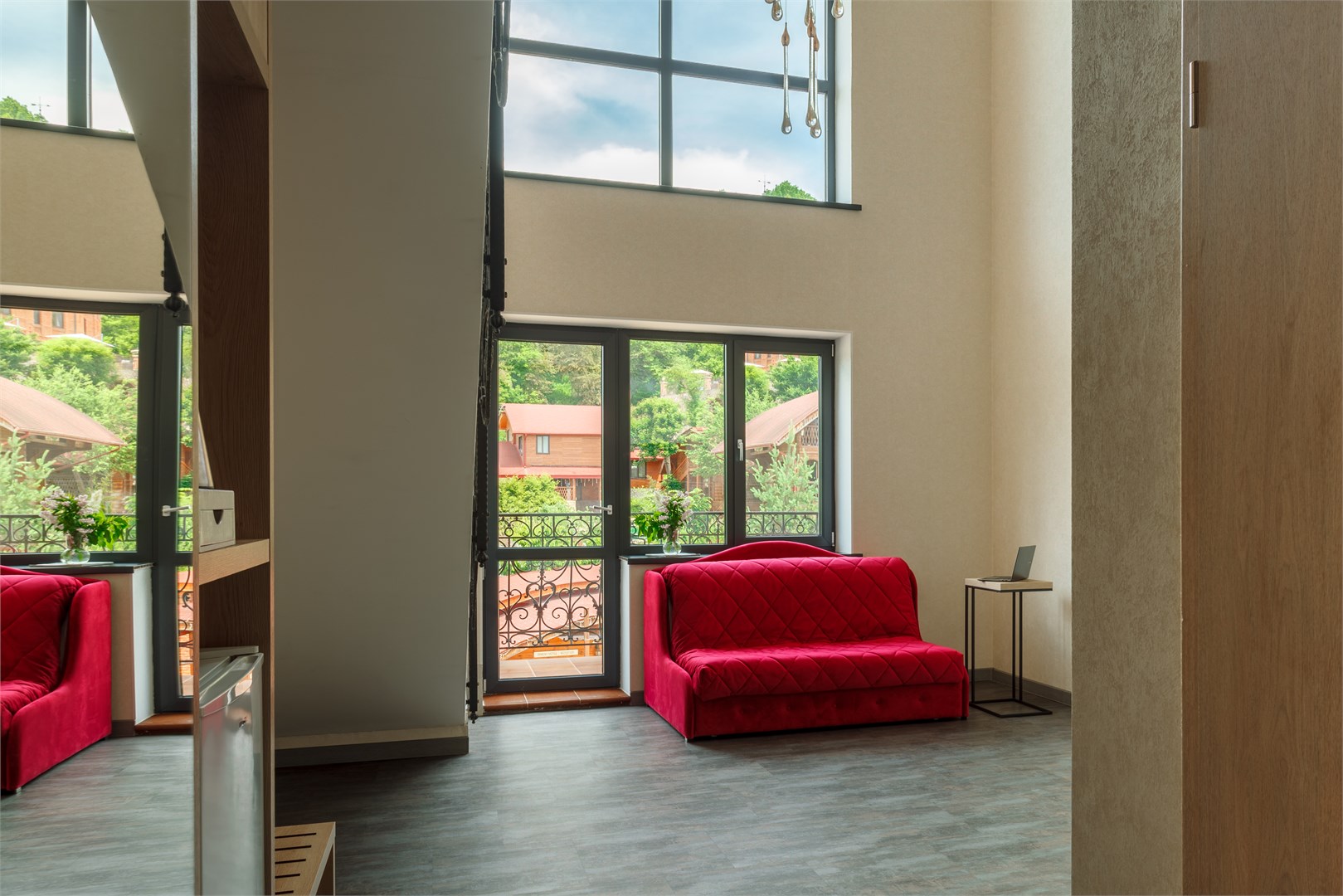 Первый ярус представлен в виде гостиной комнаты и санузла. На втором ярусе расположены 2 спальни и дополнительный санузел. Теплые полы в комнатах и ваннах. Центральное кондиционирование. Доступна терраса с панорамным видом на Кавказский хребет, оснащенная кофемашиной, кулером с водой и микроволновой печью.