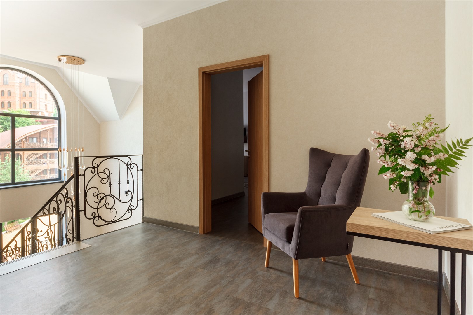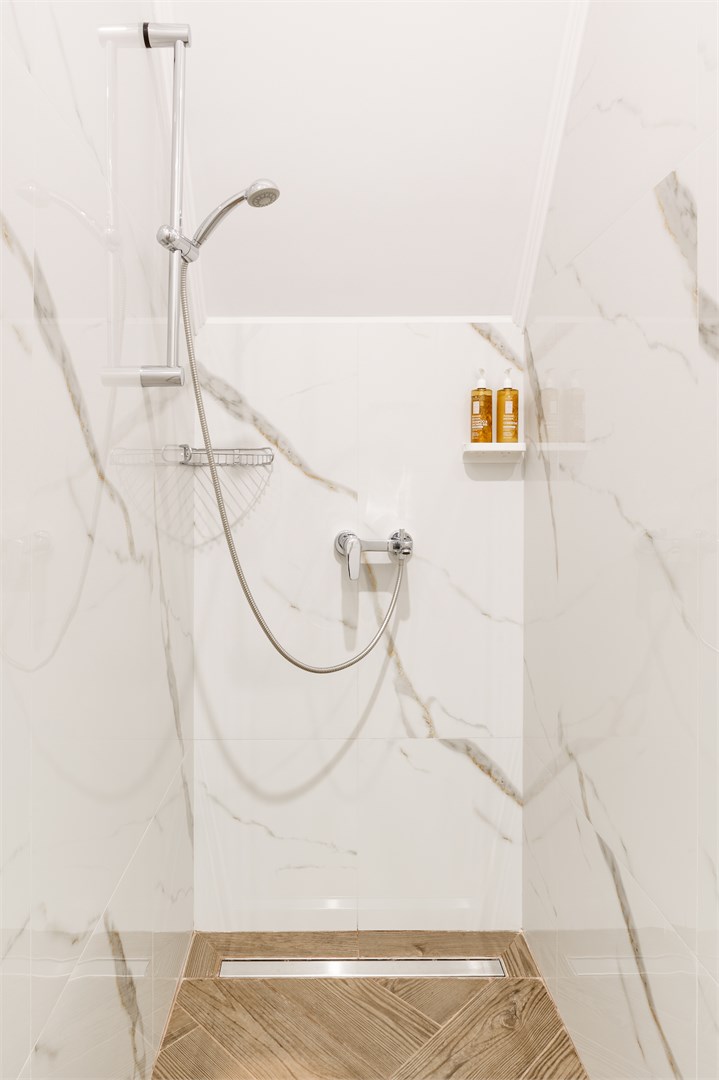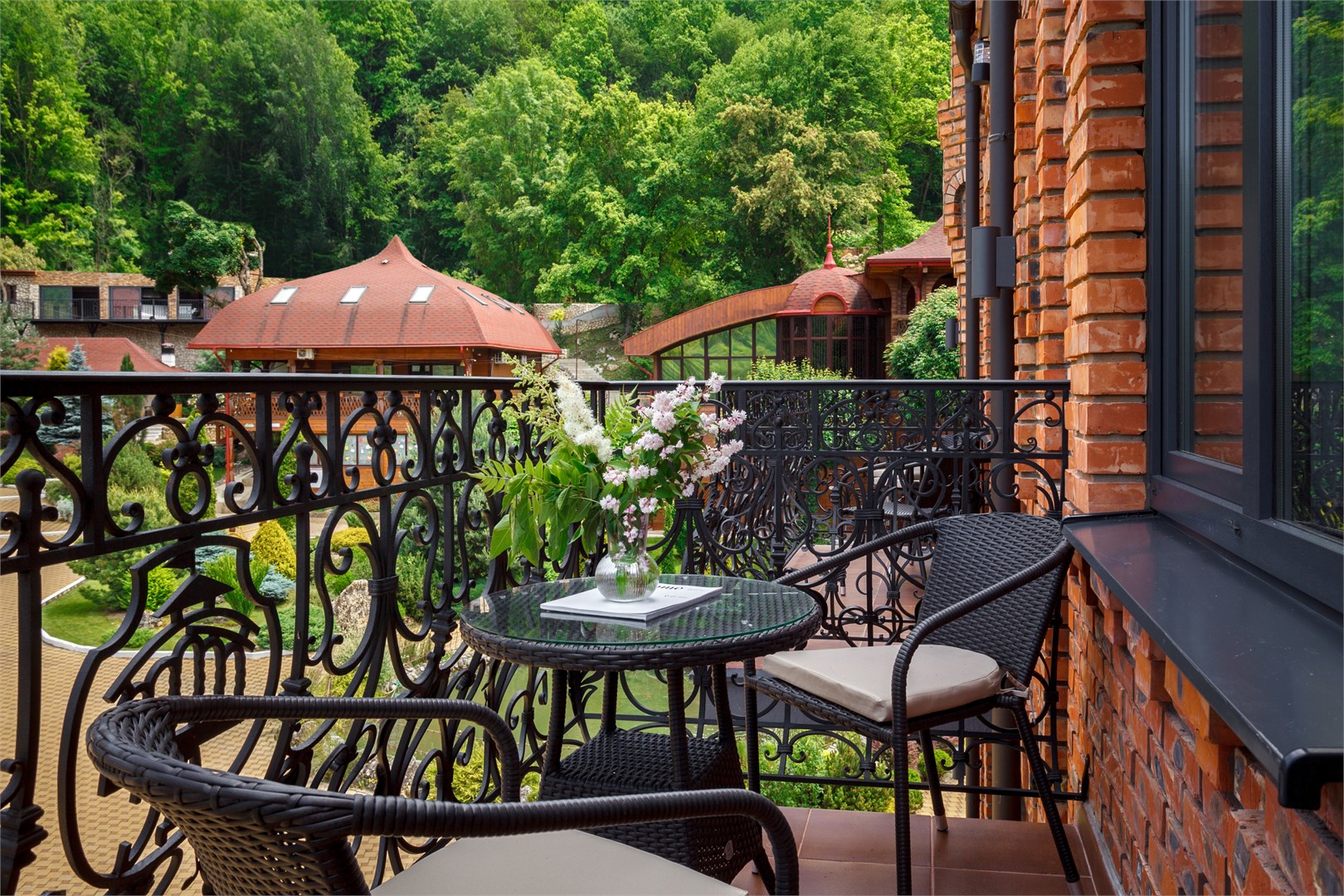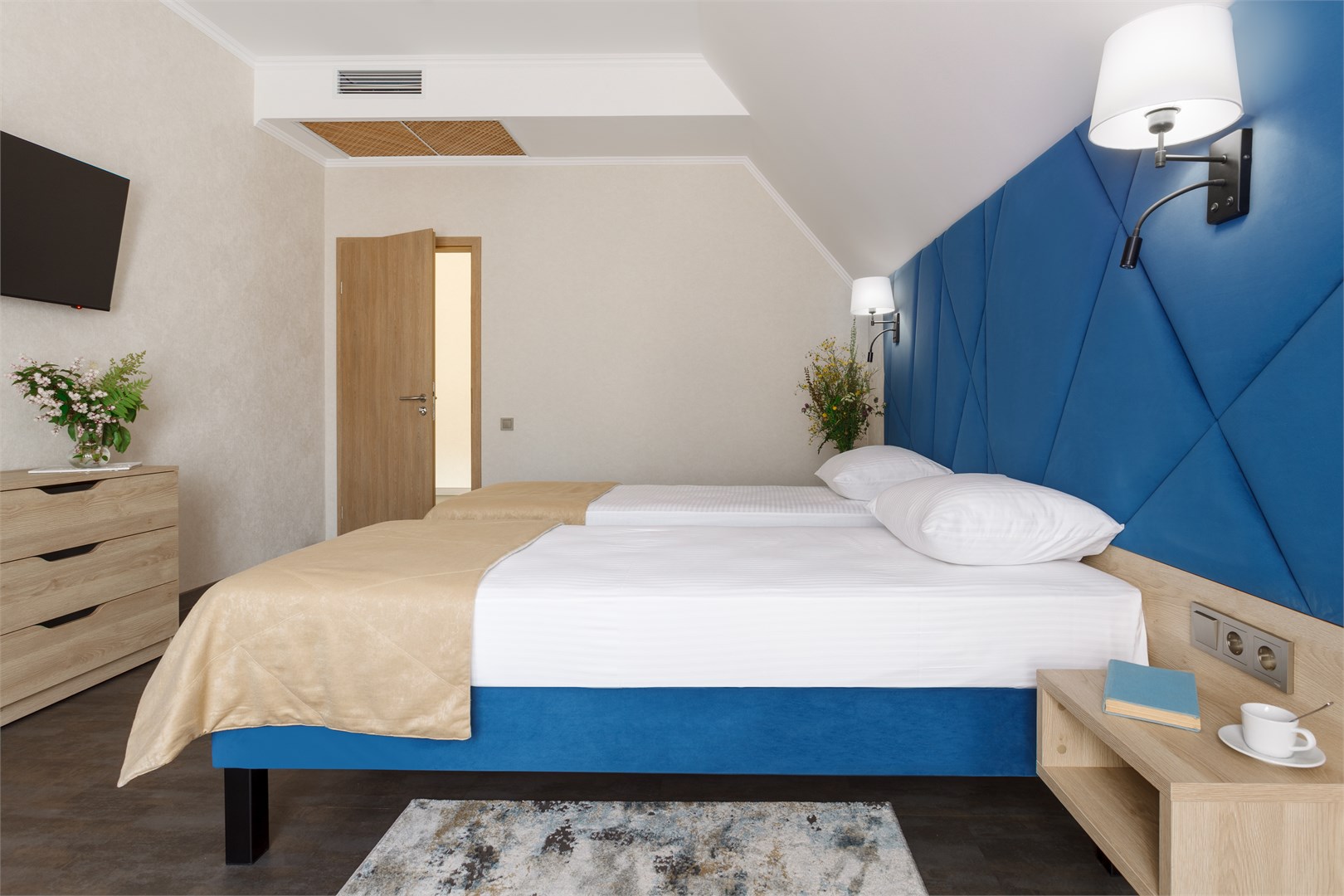 Первый ярус представлен в виде гостиной комнаты и санузла. На втором ярусе расположены 2 спальни и дополнительный санузел. Теплые полы в комнатах и ваннах. Центральное кондиционирование. Доступна терраса с панорамным видом на Кавказский хребет, оснащенная кофемашиной, кулером с водой и микроволновой печью.